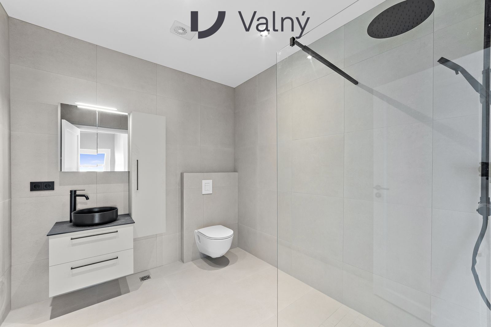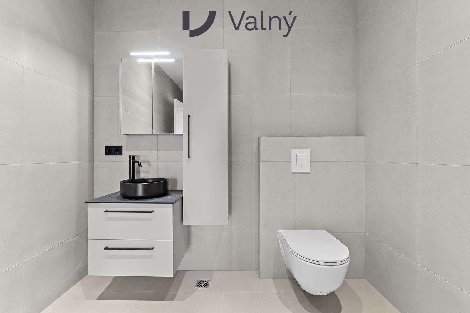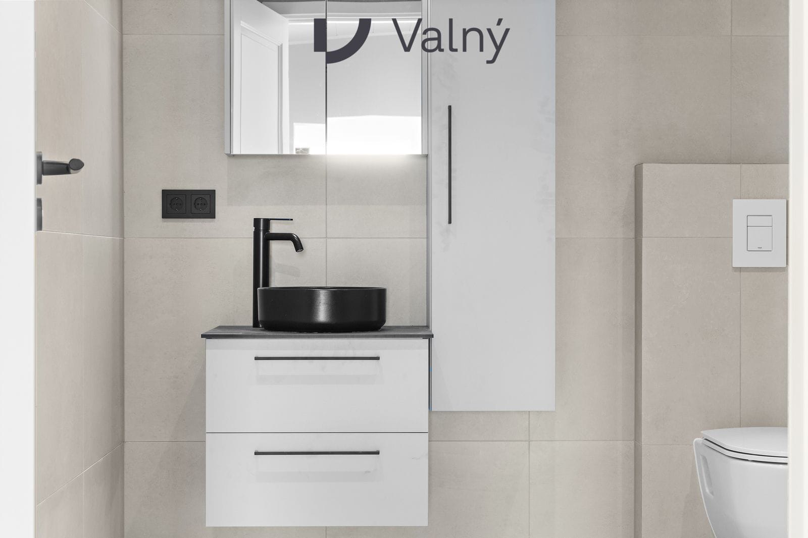 Baðherbergi með flísum í hólf og gólf, hvít/ljósgrá innrétting með melamin-áferð og fallegum svörtum blöndunartækjum, vaskur ofan á borðplötu. Walk-in sturta með þili úr hertu gleri, upphengt salerni.