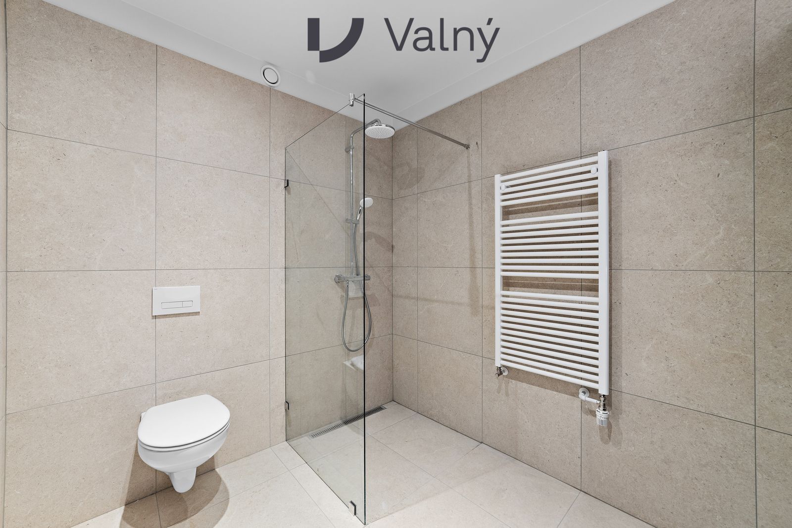Baðherbergi með innréttingu, upphengdu salerni, handklæðaofni og sturtu með glerskilrúmi. Aðstaða fyrir þvottavél og þurrkara í sérsmíðaðri innréttingu. Gólf og veggir flísalagðir, sturta flísalögð með innfelldu niðurfalli og innfelldri lýsingu. Blöndunartæki Grohe.