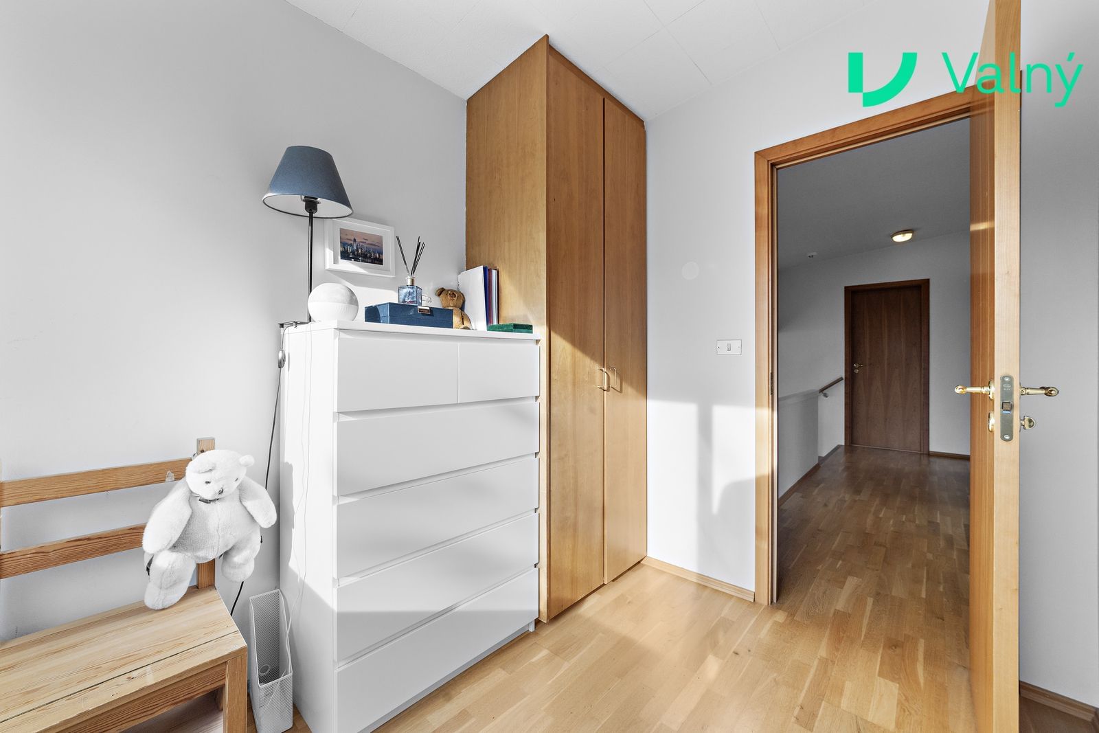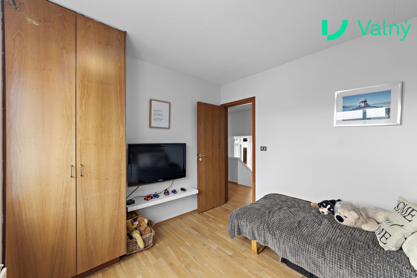 Hjónaherbergi með stórum fataskáp og viðarparketi.