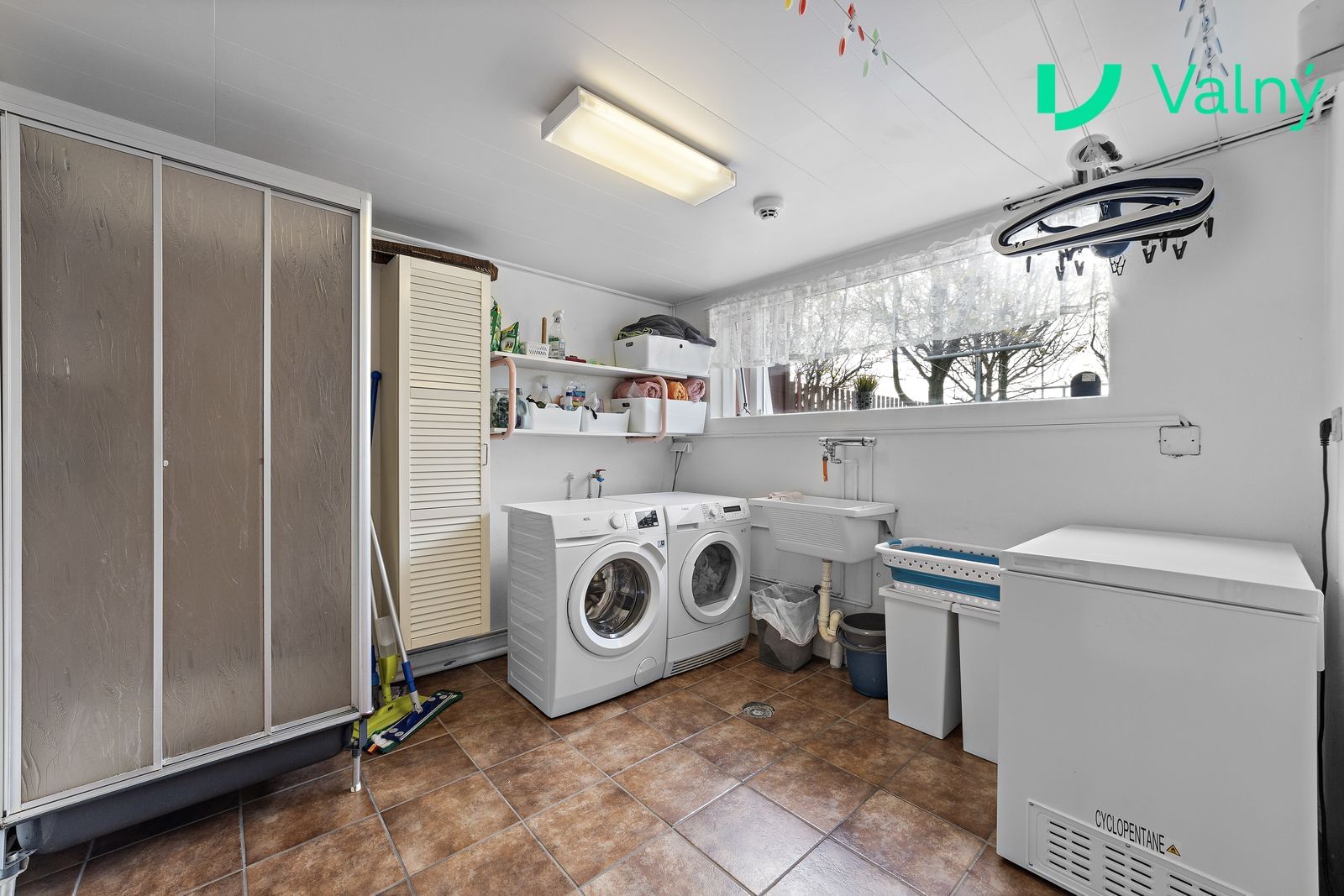 Þvottahús er rúmgott með sturtu, skolvaski og flísalögðu gólfi.