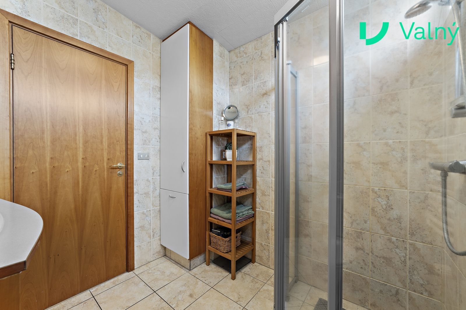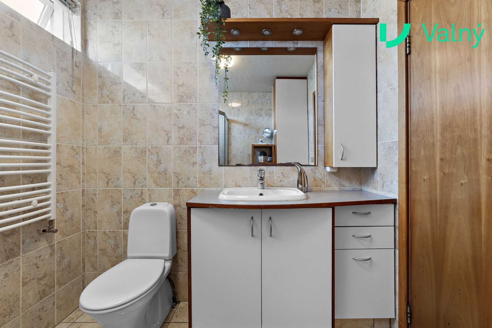 Baðherbergi flísalagt í hólf og gólf, með sturtu, salerni, handklæðaofni og innréttingu með skápaplássi.