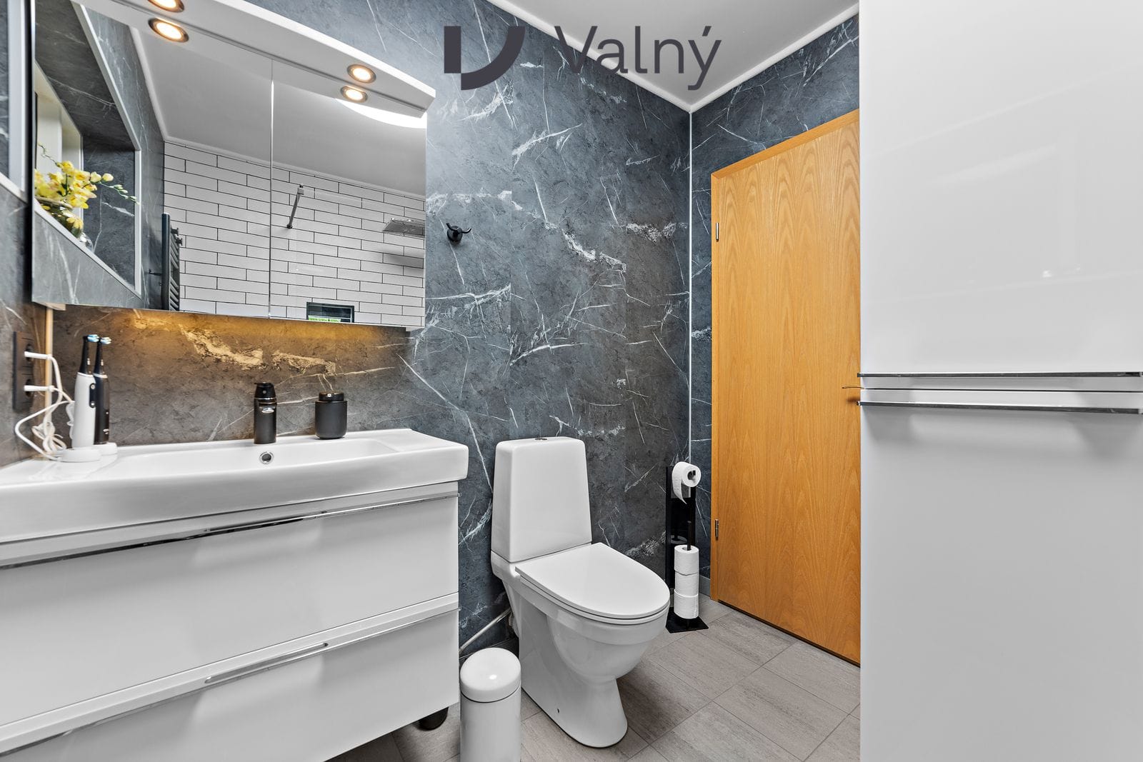 Baðherbergi flísalagt í hólf og gólf, með sturtu, salerni, handklæðaofni og innréttingu með skúffum. Baðherbergi var endurnýjað árið 2021.