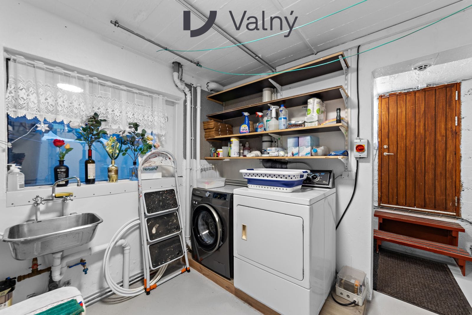 Þvottahús er á jarðhæð hússins. Málað gólf.