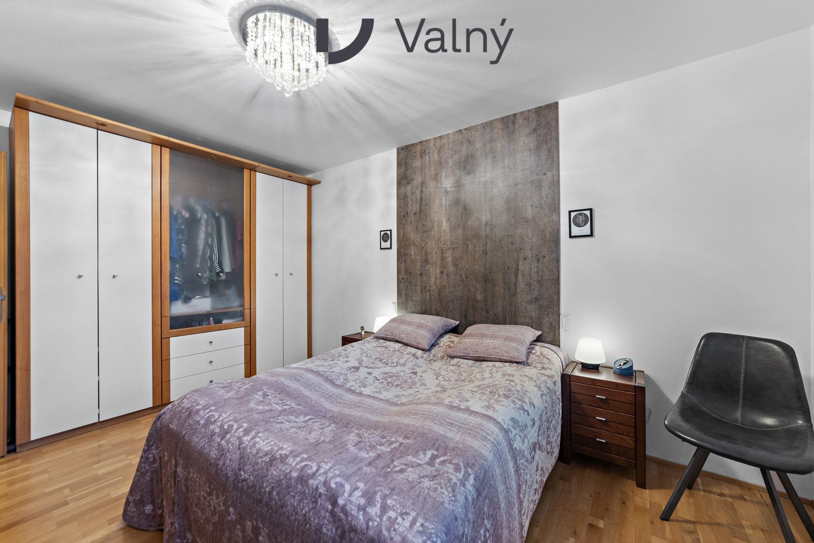 Hjónaherbergi er með viðarparketi á gólfi og fataskáp. Útgengt á aðrar svalir.