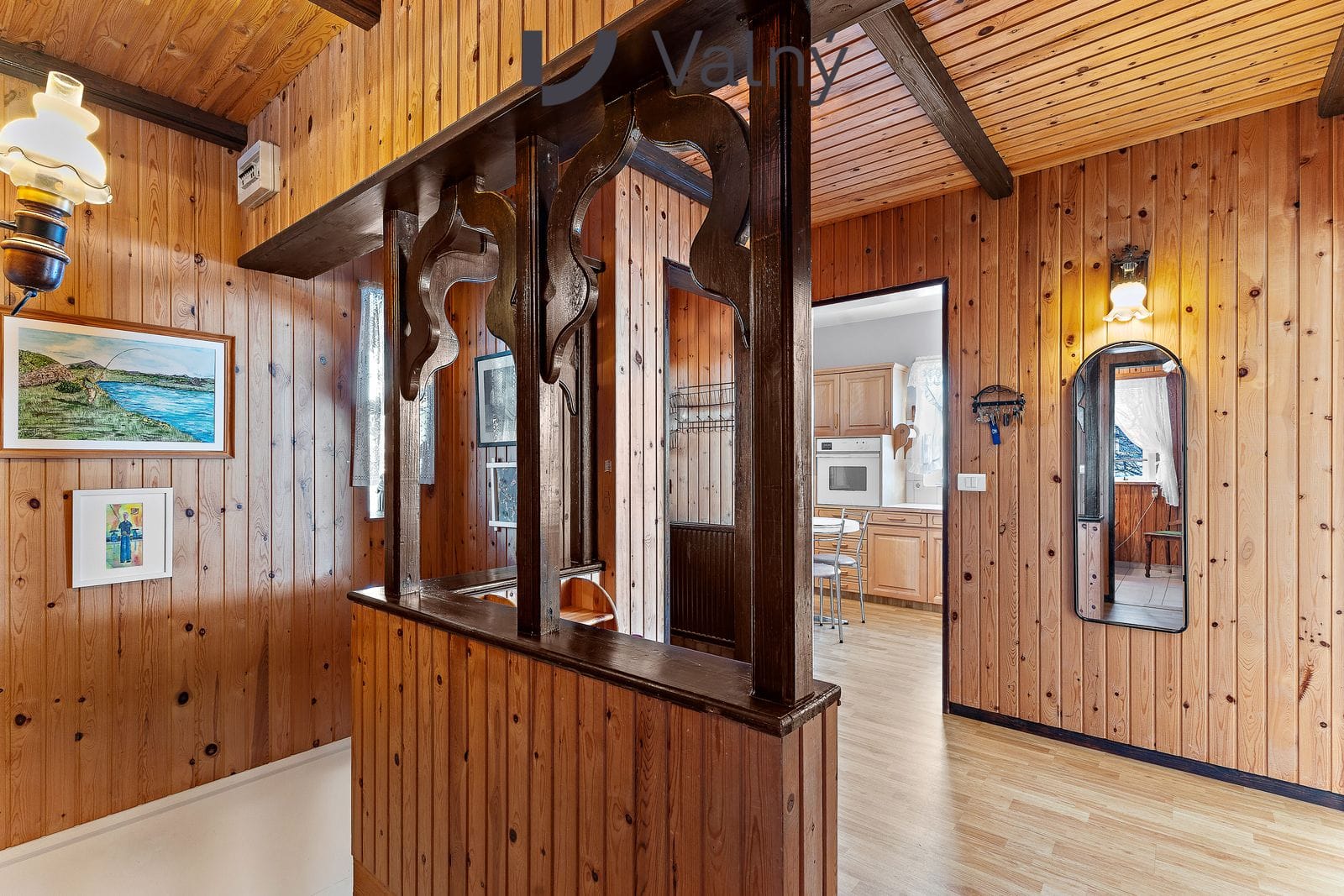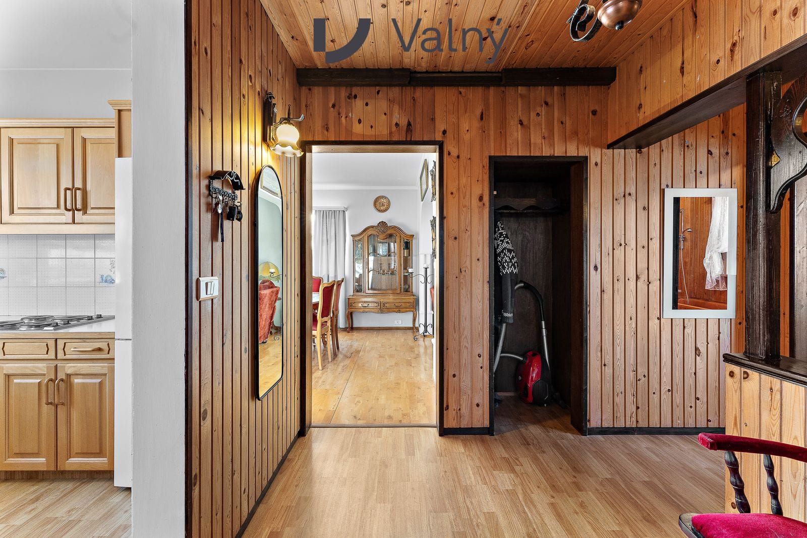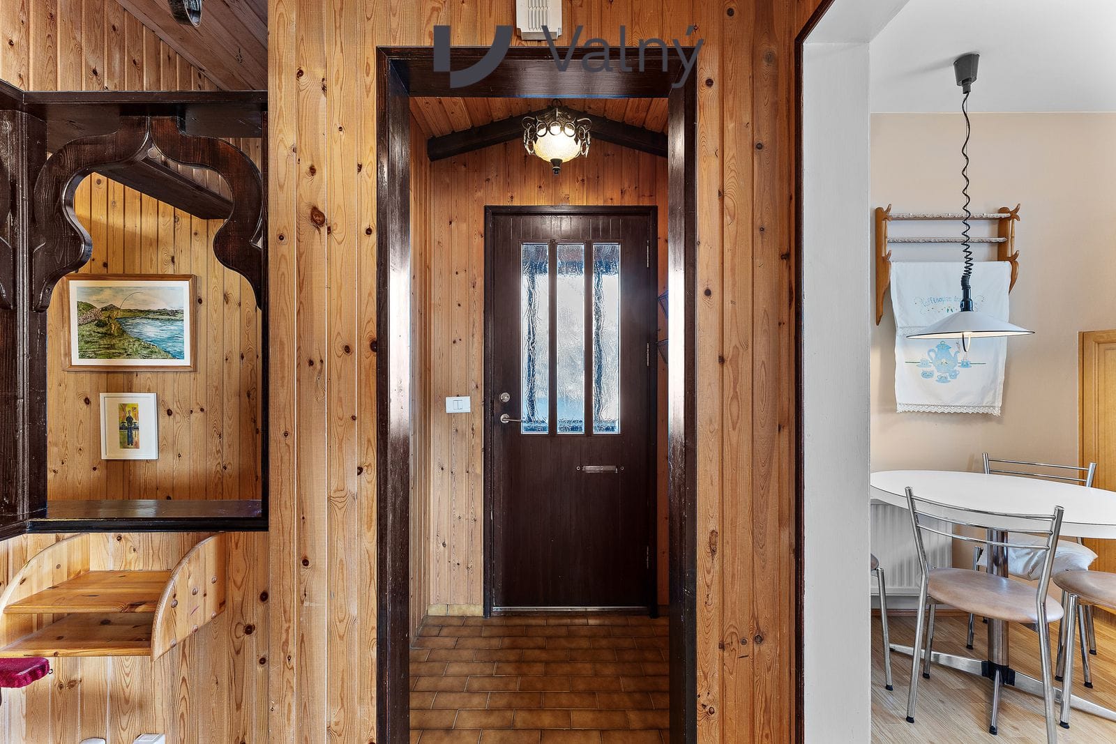 hol með flísum og parketi á gólfum. Veggir og loft klætt með panel. Fatahengi og fallgur stígi niður á neðri hæð og lúga upp í ris.