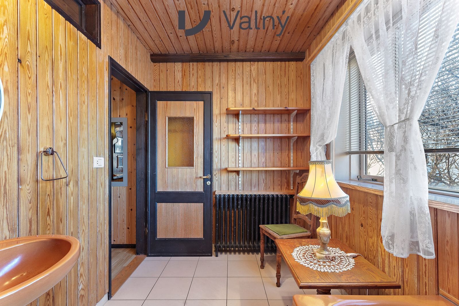 Baðherbergi er upprunalegt með baðkari, salerni og vaski. Panel á veggjum og flísar á gólfi.