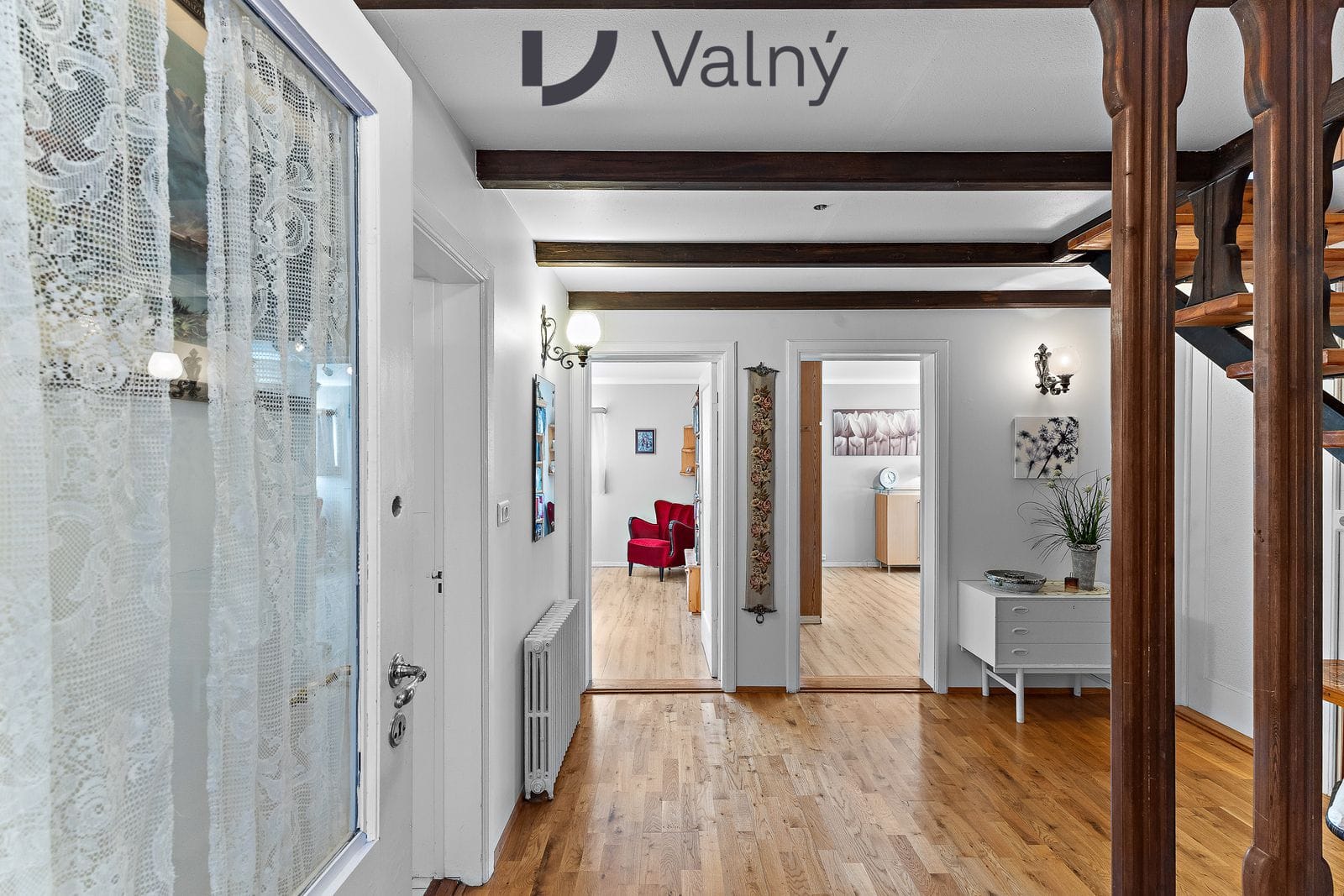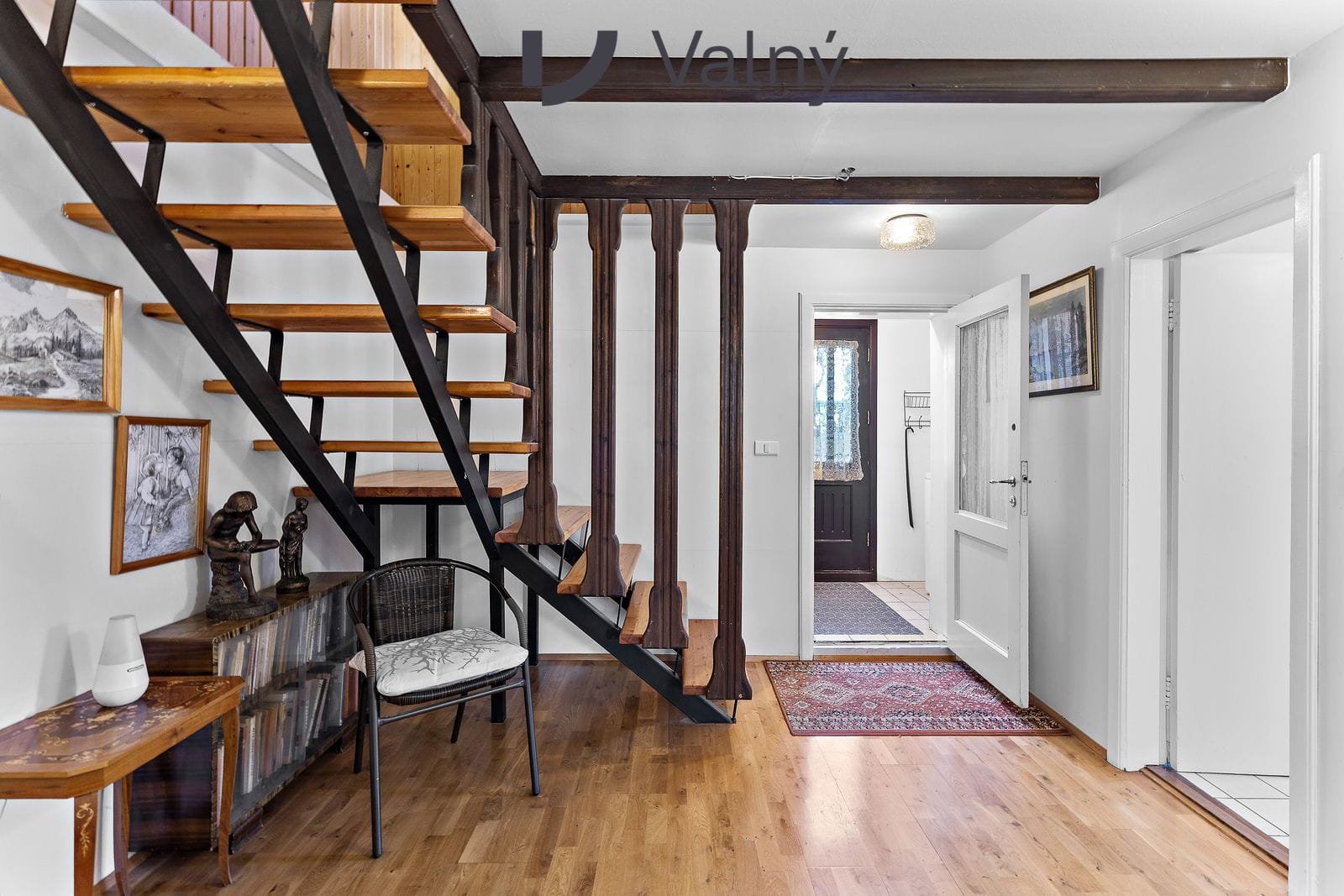 hol með flísum og parketi á gólfum.