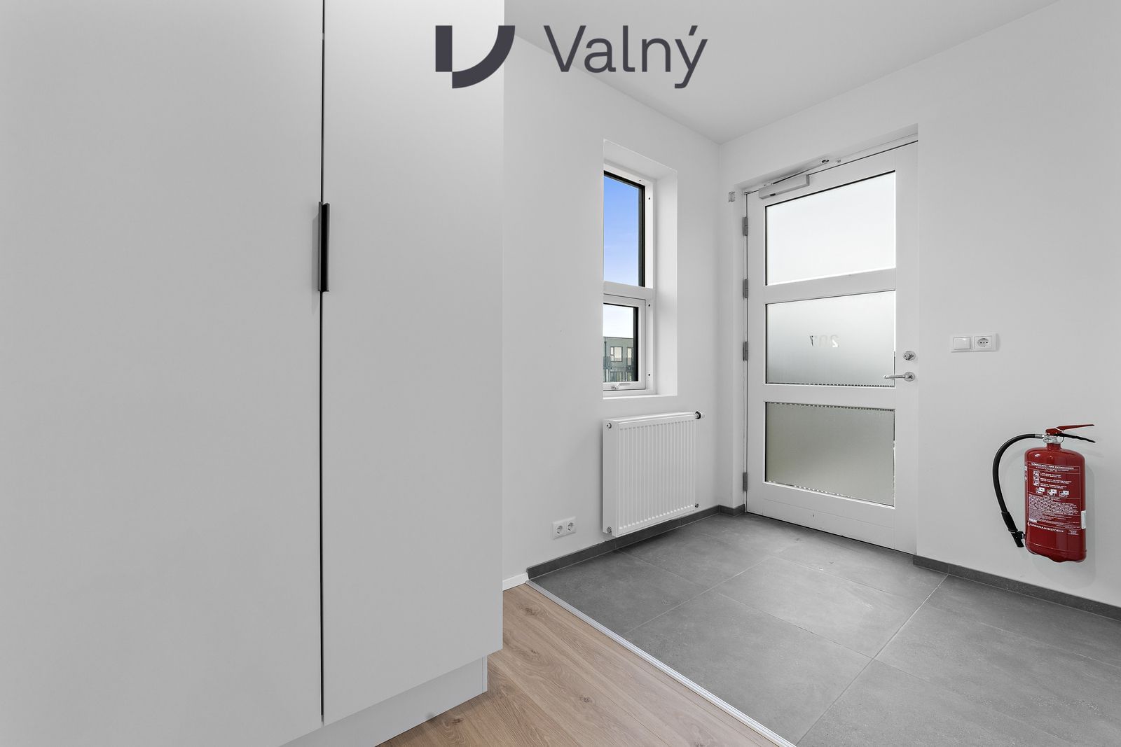Hurðir og opnanleg fög úr áli (BYKO). Innveggir og loft spartlað, grunnað og málað í ljósum lit.