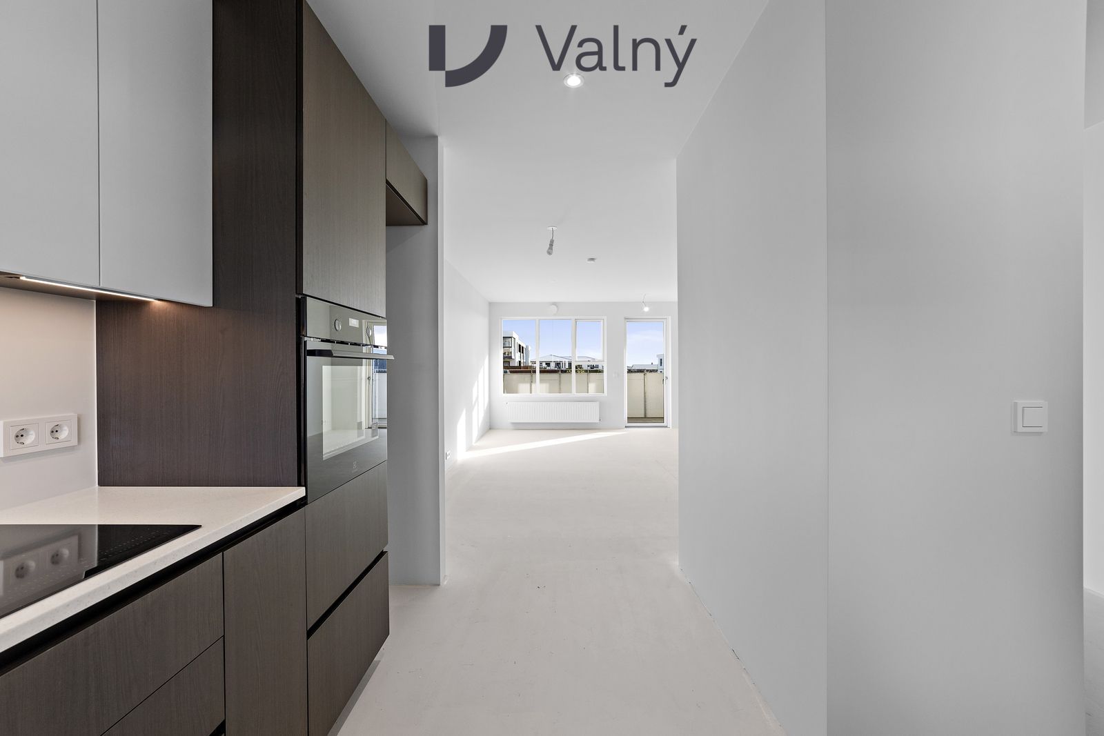 Eldhús með sérsmíðaðri innréttingu, möguleika á innbyggðri uppþvottavél, bakaraofni í vinnuhæð og helluborði. Borðplata úr ljósum Acryl-steini með vaski og innfelldri loftlýsingu. Heimilistæki frá AEG.