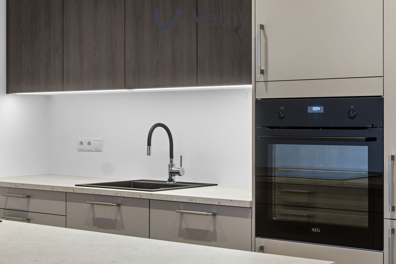 Þvottahússinnrétting fyrir þvottavél og þurrkara með skúffu undir. Íbúðin er upphituð með gólfhita.