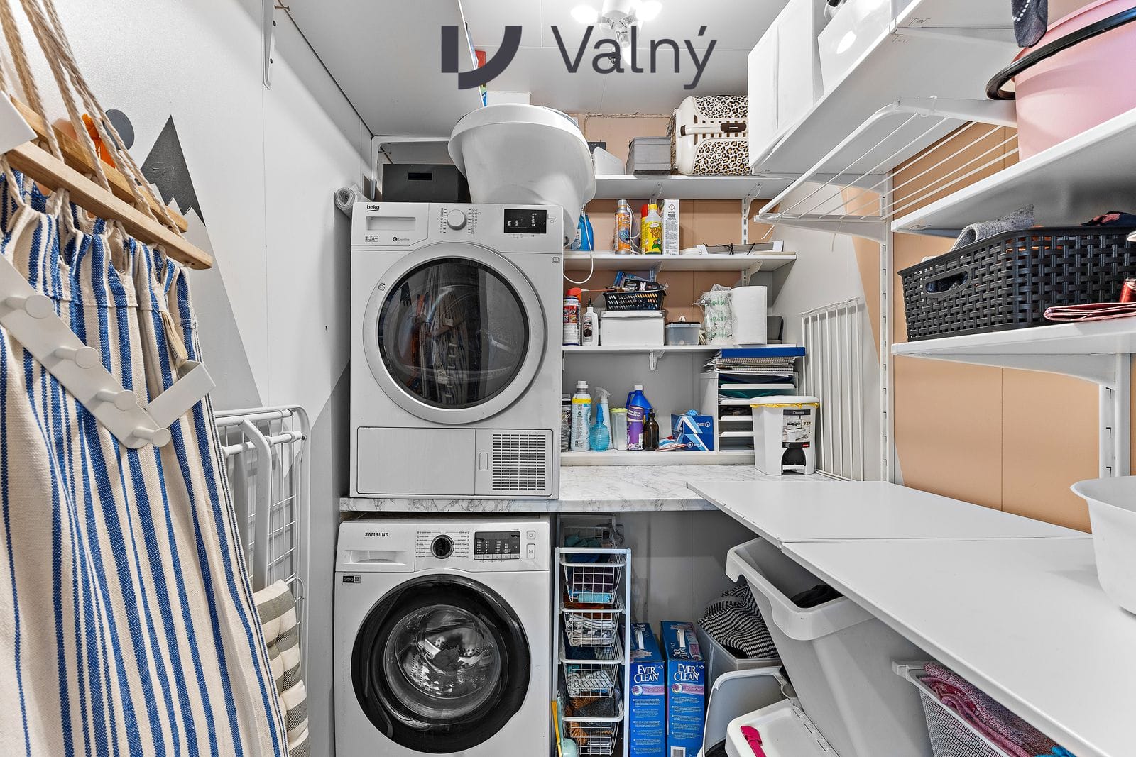 Geymsla / þvottahús með flísalögðu gólfi, hillum, borðplötu og tengi fyrir þvottavél.