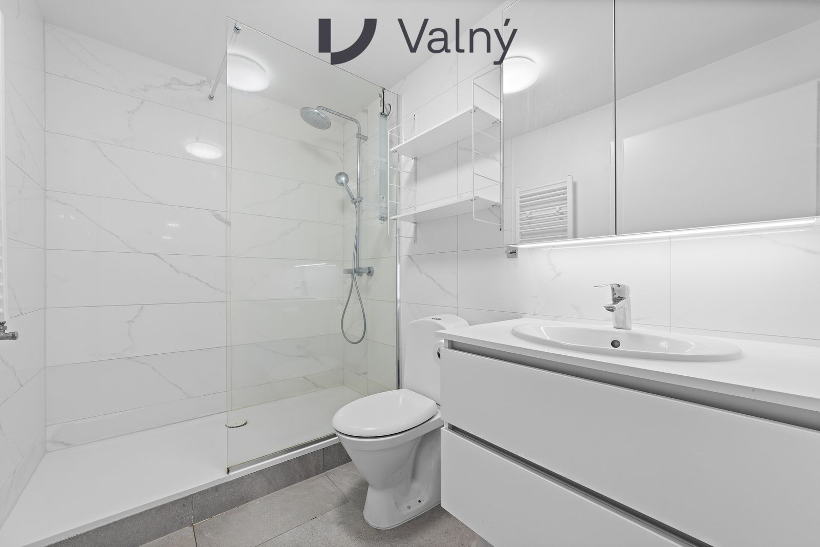 Baðherbergi hefur góða hvíta innréttingu og sturtu.