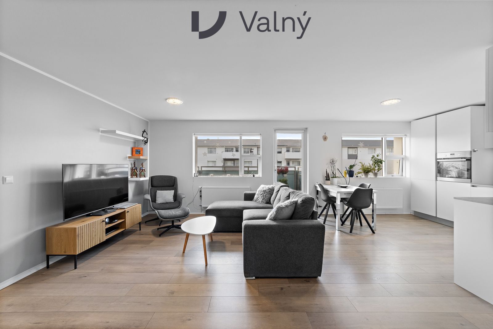 Stofan er opin við eldhús, þaðan er útgengt á rúmgóðar svalir.